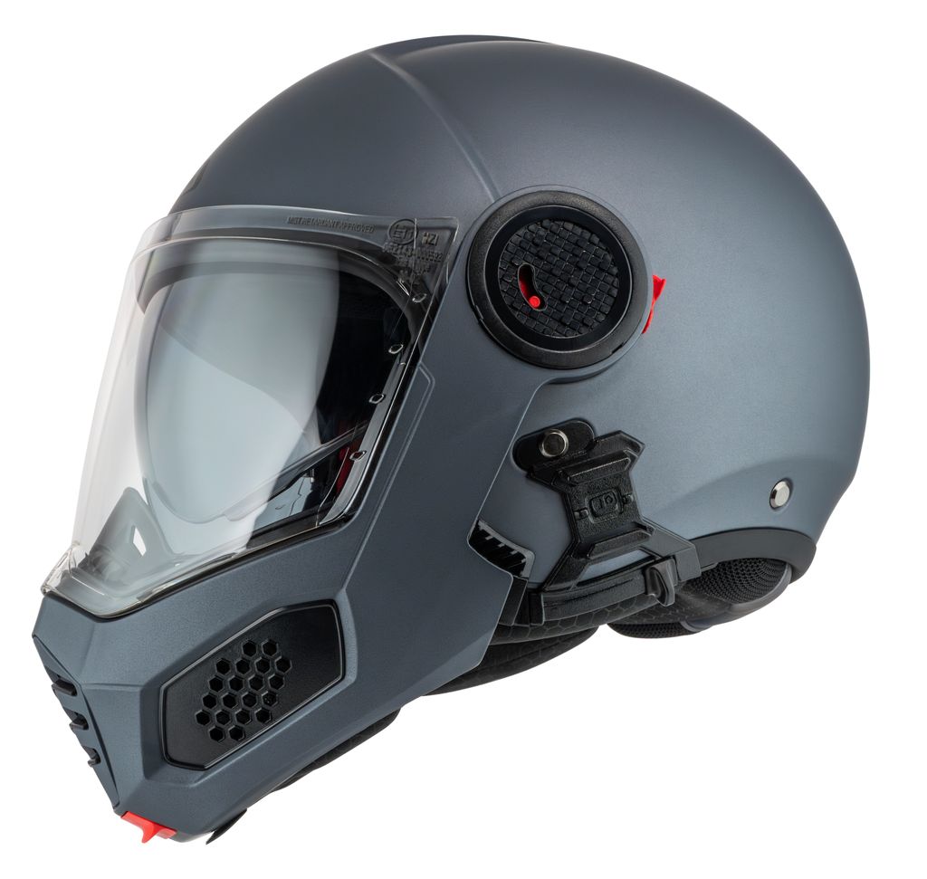 Takket være dobbelt P/J-certificering i henhold til ECE 22.06 kan du køre sikkert både med hagepartiet lukket på motorvejen eller opfældet i bytrafik.