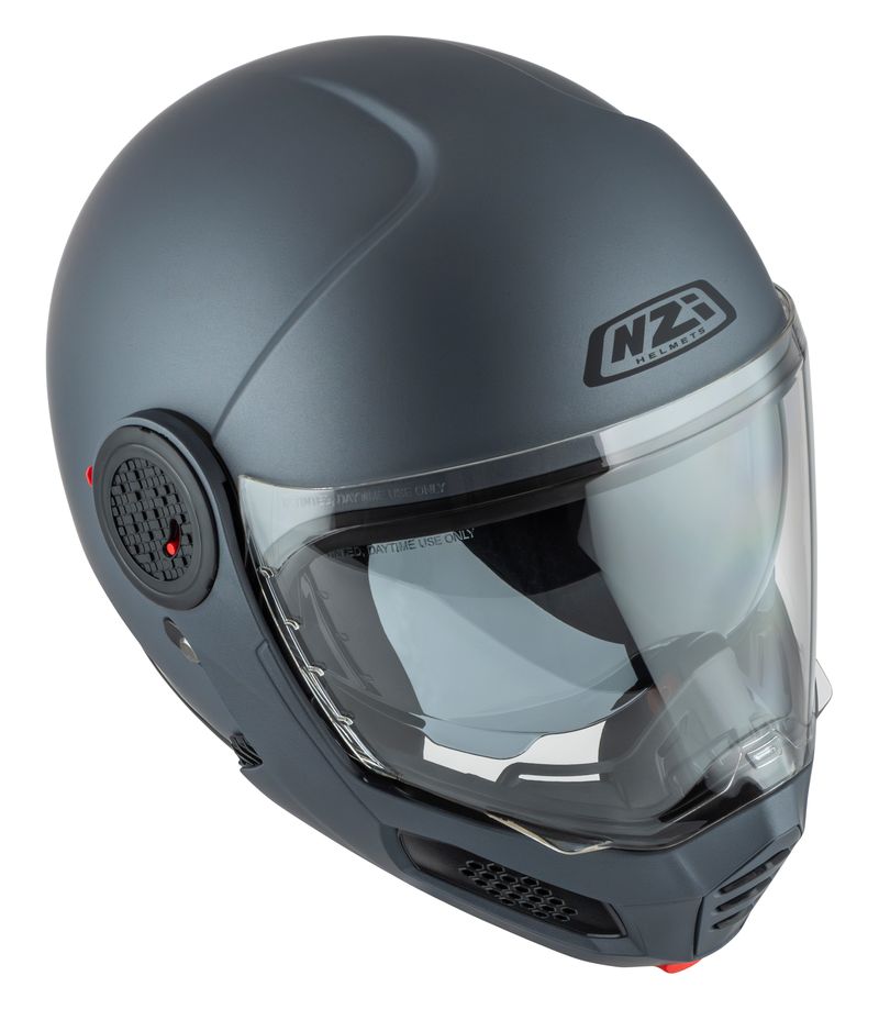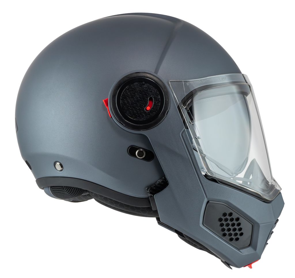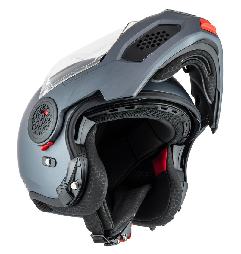 Med et enkelt tryk på en knap fældes hagepartiet op, hvilket giver bedre ventilation og fleksibilitet ved stop eller rolig bykørsel.