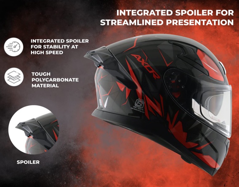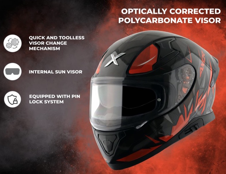 Monipositiivinen kirkas ja naarmuuntumaton visiiri - Visiiri voidaan säätää eri asentoihin ajon aikana ja siinä on naarmuuntumaton visiiri naarmujen vähentämiseksi ja jousikuormitteinen varmistaakseen tiiviimmän istuvuuden tiivisteitä vasten